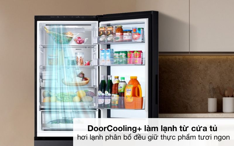 Bên cạnh đó, công nghệ DoorCooling+ kết hợp với hệ thống làm lạnh đa chiều Multi Air Flow giúp phân phối luồng khí lạnh đều khắp mọi ngăn tủ, kể cả khu vực cửa nơi thường có nhiệt độ thấp hơn. Nhờ vậy, toàn bộ thực phẩm trong tủ được làm lạnh đồng đều, bảo quản hiệu quả hơn.