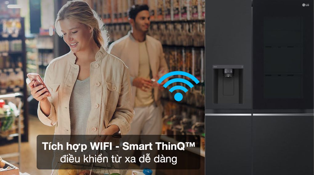 Chiếc Tủ lạnh LG Inverter 635 Lít Side By Side InstaView Door-in-Door GR-X257BL có hỗ trợ kết nối wi-fi với ứng dụng Smart ThinQ cho người dùng mọi lúc mọi nơi cũng có thể theo dõi kiểm soát hoạt động của máy ngay trên chiếc điện thoại của mình.
