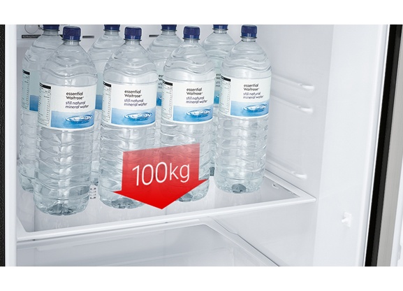 Bên trong tủ lạnh chia thành nhiều khay kệ nhỏ được làm từ các kính chịu lực siêu bền chắc có khả năng nâng đỡ lên đến 100kg. Nhờ đó, người dùng sẽ được thoải mái dự trữ thực phẩm có kích thước trọng lượng cực lớn. Ngoài ra, khay kính này còn có chống trầy xước, việc vệ sinh cũng đơn giản, dễ dàng.
