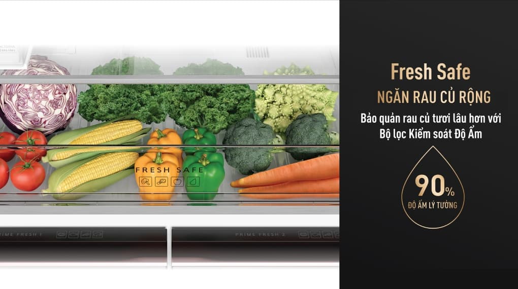 - Ngăn rau củ Fresh Safe rộng rãi có thể giữ đến 90% độ ẩm cho rau củ luôn tươi ngon.