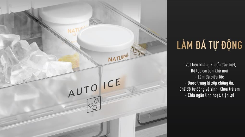 Khay làm đá tự động rộng rãi và luôn được diệt khuẩn sạch sẽ. Người dùng chỉ cần đổ nước vào hộp chứa và chờ đợi một thời gian ngắn là có ngay những viên đá viên tinh khiết cho ly nước mát lạnh. Khay đá này cũng giúp tiết kiệm bớt thời gian hơn so với cách làm đá viên truyền thống.