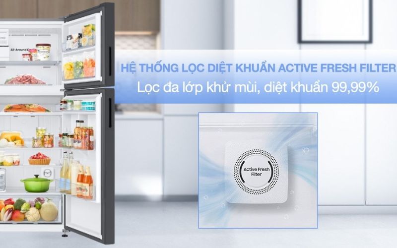 Không gian bên trong tủ luôn duy trì trong lành, đảm bảo an toàn vệ sinh tối đa khi trang bị bộ lọc tiên tiến Active Fresh Filter có khả năng loại bỏ mọi mùi hôi, diệt khuẩn mạnh mẽ đến 99.99% vi khuẩn. Hệ thống lọc còn hỗ trợ lọc khí liên tục, hạn chế lẫn lộn mùi, ngăn chặn phát sinh mùi hôi khó chịu, đảm bảo thực phẩm duy trì được độ thơm ngon, dưỡng chất trong thời gian dài.