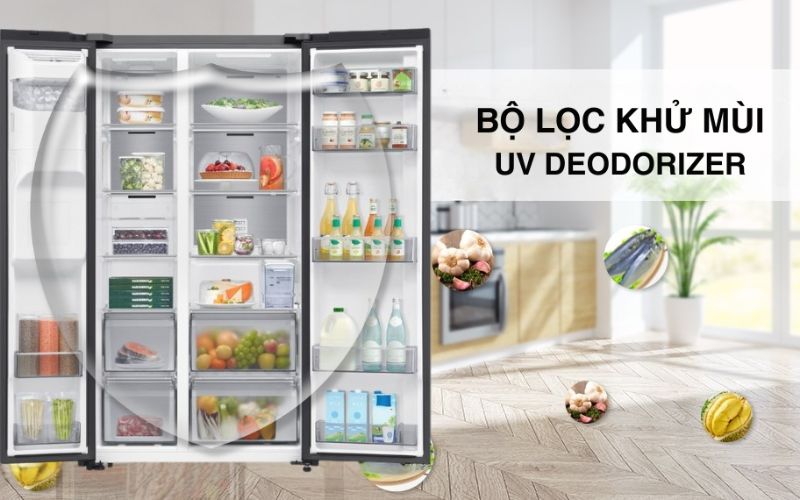 Bên trong tủ lạnh Samsung được tích hợp bộ lọc than hoạt tính UV Deodorizer hiện đại, khử mùi hiệu quả và loại bỏ vi khuẩn gây hại, cho không gian bảo quản sạch sẽ, trong lành, không ám mùi khó chịu. Bộ lọc UV Deodorizer còn có khả năng ngăn chặn sự lẫn mùi giữa các loại thực phẩm, giúp thực phẩm giữ được mùi vị đặc trưng, độ tươi ngon nguyên vẹn. Nhờ đó, bạn có thể yên tâm lưu trữ nhiều loại thực phẩm cùng lúc mà vẫn đảm bảo vệ sinh, chất lượng, an toàn thực phẩm cho cả gia đình.