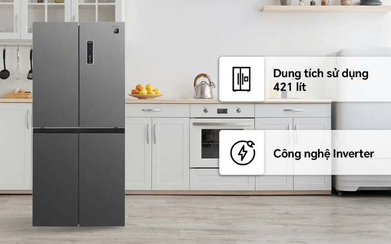 Chiếc tủ lạnh Sharp 4 cánh sở hữu dung tích sử dụng lớn lên đến 421 lít, gồm ngăn đá 150 lít và ngăn lạnh 271 lít, đáp ứng thoải mái nhu cầu lưu trữ thực phẩm đa dạng cho gia đình trên 5 thành viên.