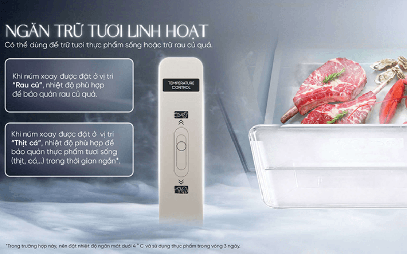 Bên cạnh đó, tủ lạnh còn sở hữu ngăn trữ tươi linh hoạt, dễ dàng chuyển đổi công năng theo nhu cầu như bảo quản rau củ, thịt cá ở trạng thái đông mềm, hoặc giữ độ tươi ngon lên đến 3 ngày ở mức nhiệt lý tưởng. Tất cả thao tác đều được thực hiện đơn giản, nhanh chóng chỉ với một nút gạt tiện lợi.