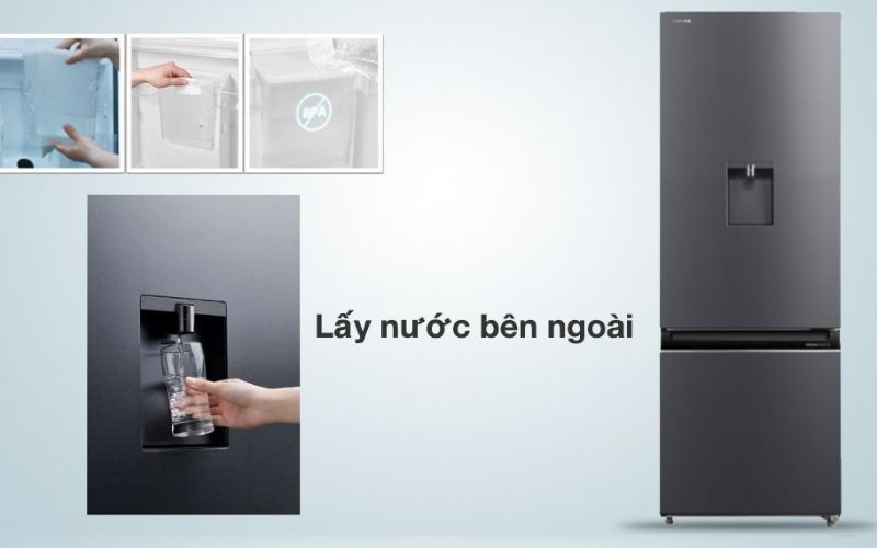 Lấy nước ngoài tiện lợi với hợp nước 2 lít bằng vật liệu an toàn không chứa BPA, có vòi lấy nước ở bên ngoài cánh cửa cho bạn thoải mái lấy nước mát mà không cần mở cửa tủ.