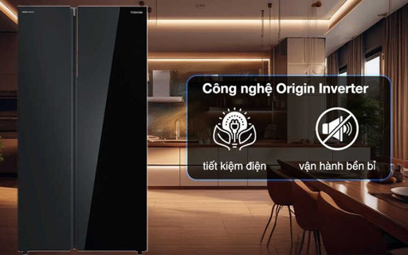 Một điểm nổi bật nữa của chiếc tủ lạnh Toshiba là tích hợp công nghệ Origin Inverter vận hành hiệu quả, ổn định, duy trì độ lạnh hoàn hảo cho thực phẩm luôn tươi ngon. Công nghệ Origin Inverter còn cho quá trình vận hành êm ái, giảm thiểu độ ồn cho không gian sống luôn thoải mái, yên tĩnh, và còn góp phần tiết kiệm vượt trội điện năng, gia đình có thể thoải mái sử dụng mà không cần lo lắng về chi phí hóa đơn điện mỗi tháng.