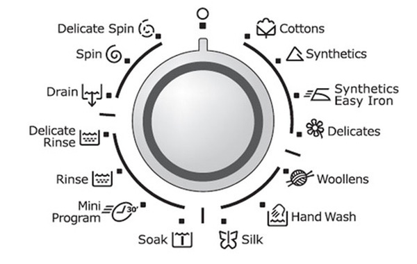 - Trên máy giặt có kí hiệu của rất nhiều loại quần áo khác nhau nhắc bạn chọn chế độ giặt phù hợp. Những kí hiệu đó ngụ ý rằng với quần áo có chất liệu khác nhau thì bạn nên chọn giặt theo chế độ đó thay vì việc chọn chế độ giặt mặc định. Với tính năng này, các bà nội trợ nên phân loại quần áo trước khi giặt để máy giặt làm việc hiệu quả hơn.