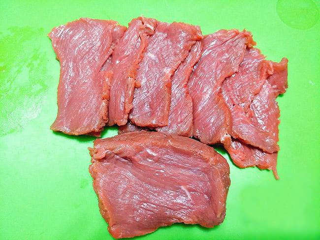 Bước 1: Thịt bò phi lê đem rửa sạch sẽ rồi thấm khô nước. Tiếp theo, thái dọc theo thớ của miếng thịt, độ dầy khoảng 0,5cm.