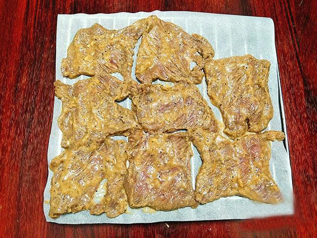 Bước 5: Thịt bò sau khi đã ướp xong, bật lò nướng 100 độ C làm nóng lò. Tiếp theo xếp từng miếng thịt bò vào khay nướng có lót giấy nến.