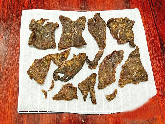 Bước 6: Cho khay thịt bò vào lò nướng và đem sấy khoảng 2,5-3 tiếng. Thi thoảng, lấy ra lật từng miếng thịt bò cho thịt chín đều rồi tiếp tục đem sấy tới khi thịt bò khô lại.