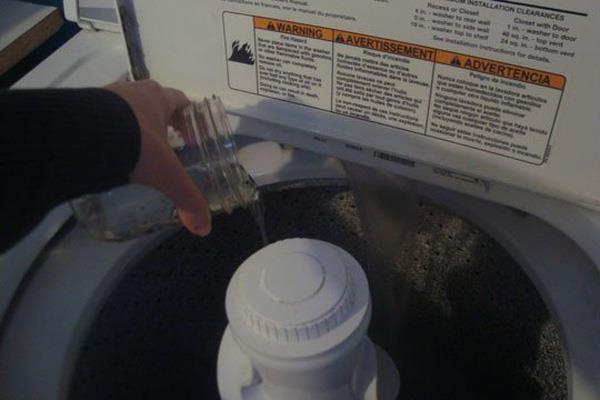 Bước 2: Sau khi nước đã đầy lồng giặt, hãy đổ hai cốc dấm ăn vào và ngâm trong một tiếng đồng hồ. Bạn cũng có thể dùng các chất tẩy chuyên dụng khác nhưng nên dùng dấm ăn vì nó có thể khử trùng rất tốt mà lại không có độc tố.