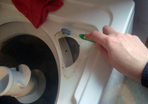 Bước 4: Trong thời gian chờ ngâm lồng giặt, hãy dùng miếng vải và bàn chải để vệ sinh bên ngoài và dưới nắp máy giặt.